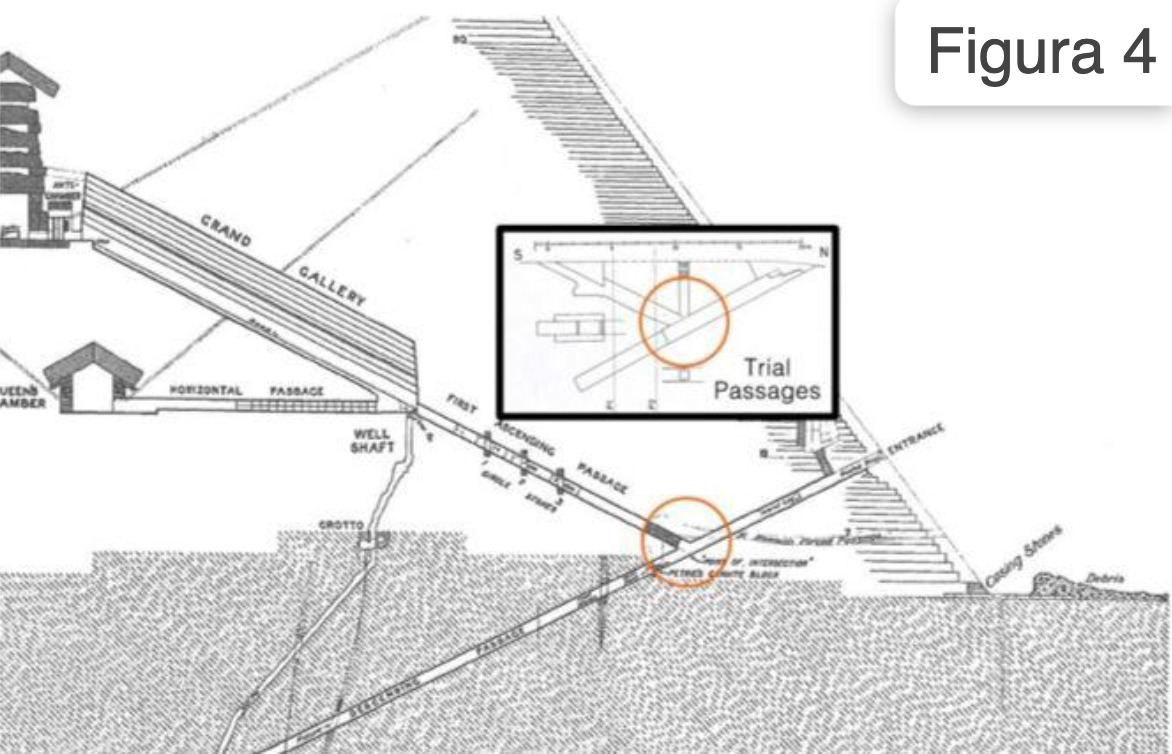 Un aspetto interessante di questa “piantina in scala” è che esiste unicamente per la Grande Piramide, nessuna delle altre ne ha una e questo, dovete ammetterlo, da alquanto da pensare: e se si trattasse proprio di un “codice” lasciatoci dai costruttori per svelare i segreti della grande costruzione? Parecchi altri dettagli supportano questa ipotesi, che diventa ancora più intrigante se si osserva una mappa (Figura 4) dei trial passages raffigurante l’incrocio tra il tunnel discendente e quello ascendente e la si confronta con quella della Grande Piramide. Tra l’altro il tunnel discendente reca delle tacche incise nelle pareti, dei marcatori, il cui scopo non è mai stato chiarito, ma che potrebbero proprio fare riferimento alla “mappa in scala” ed alla sua interpretazione.