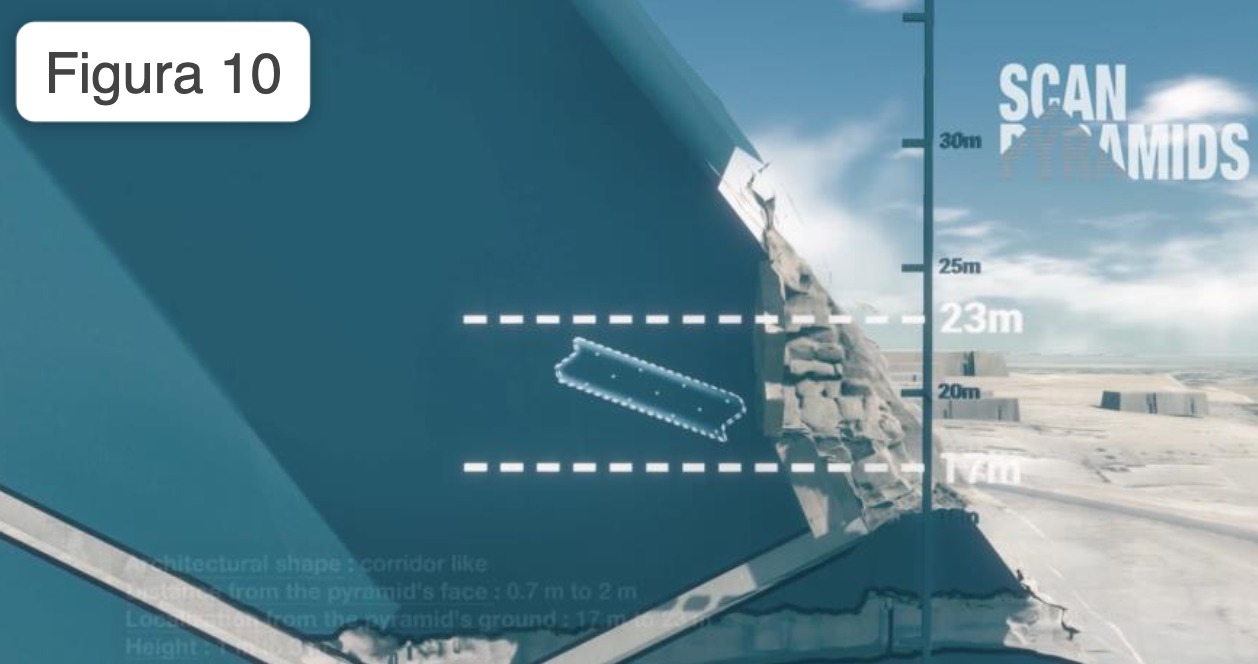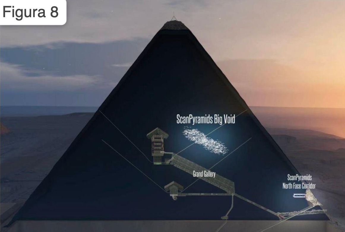 Questo grande vuoto è coerente con le analisi di microgravità degli anni ottanta menzionate in “PRIMA DI NOI” e potenzialmente compatibile con lo strano ed inspiegabile disallineamento della Grande Galleria rispetto all’asse nord sud. Questo ritrovamento fa inoltre seguito a quello annunciato nel 2016 che ha identificato un vuoto subito sopra l’entrata originale della Grande Piramide sulla facciata nord (Figura 8).