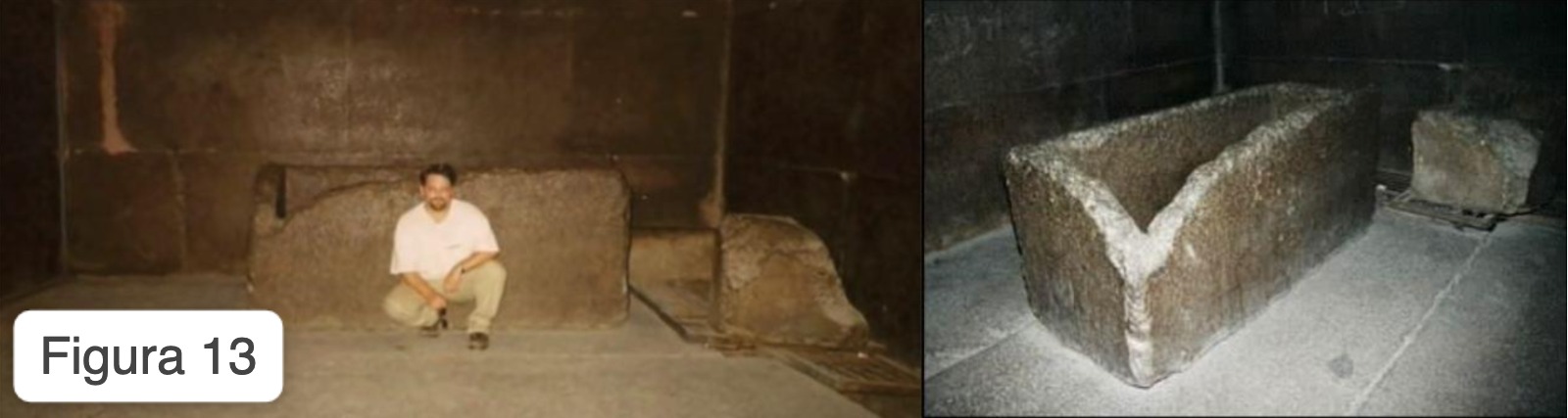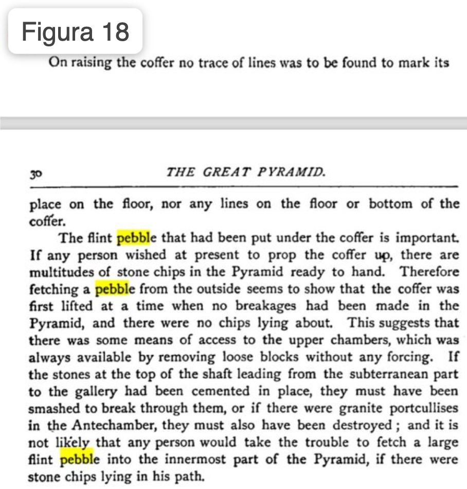 Nell’estratto in Figura 18 egli fa notare il ritrovamento di un sassolino di provenienza esterna alla piramide proprio sotto il “sarcofago”. Se quest’ultimo fosse stato posizionato durante la costruzione con buona probabilità avrebbero usato una delle numerose scaglie di roccia presenti in loco e derivanti dalla lavorazione in corso e non un sasso portato appositamente dall’esterno. Secondo tale logica il “sarcofago” sarebbe stato posizionato nella Camera del Re a lavori ultimati, motivo per cui deve esistere un ingresso nascosto.