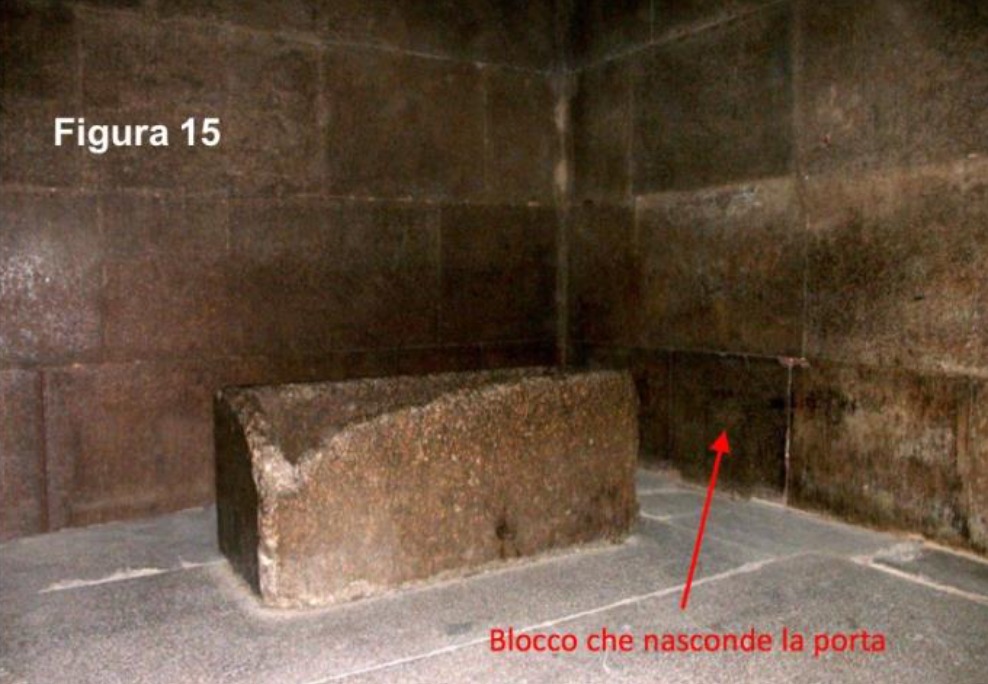 Questi due particolari portano ad una semplice quanto dissacrante conclusione: l’ingresso fu sigillato con un blocco di granito dall’INTERNO della Camera del Re, per cui gioco forza deve esserci un’ALTRA USCITA dalla stanza. In alcune fotografie si nota ancora un blocco di granito abbandonato a fianco del “sarcofago”, che alcuni, a mio parere sbagliando, ritengono estratto dal pavimento della Camera del Re e su questo punto torneremo a breve.