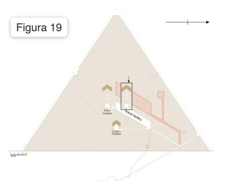 A differenza di quella della Regina, la Camera del Re è poi chiaramente posizionata non sulla mediana della piramide, ma più spostata a sud. Queste apparenti mancanze di simmetria tendono a disturbarmi, ma adesso che emergono indizi inerenti la possibile presenza di un’ulteriore vano sul lato nord della Camera del Re, potremmo aver trovato una spiegazione logica anche a questa apparente incongruenza (Figura 19).