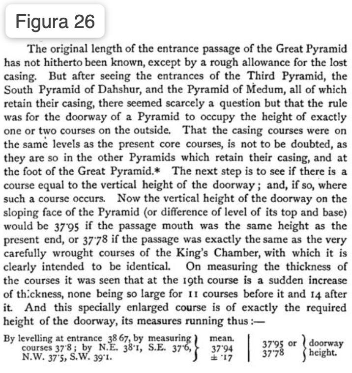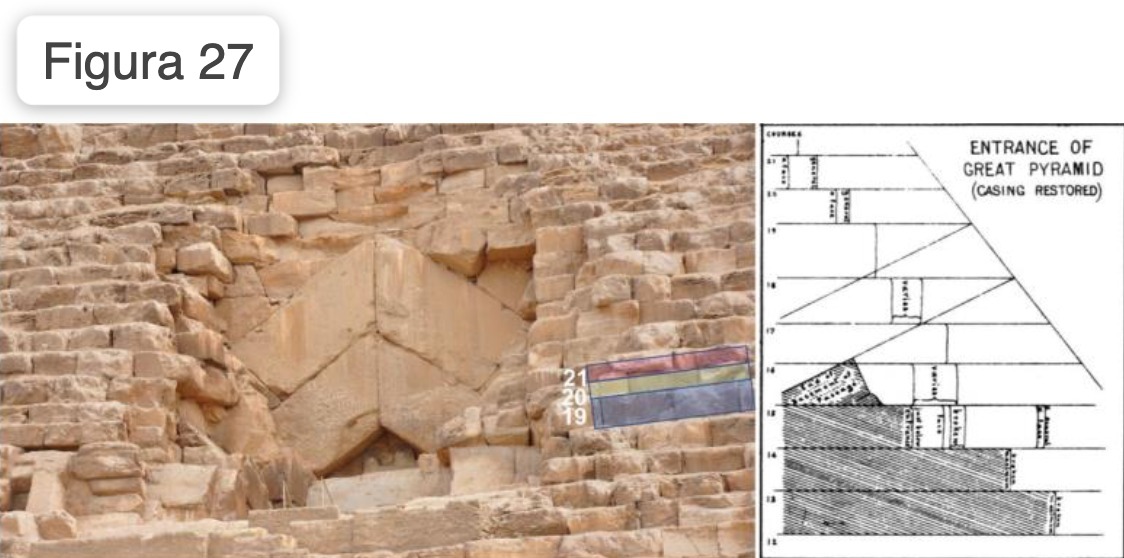 Questa strana mancanza di coerenza costruttiva nei pressi del diciannovesimo corso di blocchi della Grande Piramide non era assolutamente sfuggita all’occhio attento e perspicace di Flinders Petrie, che la pose in evidenza in “The pyramids and temples of Gizeh” (Figura 26).