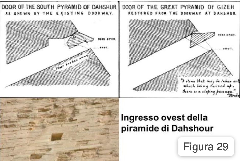 Esistono ovviamente altri indizi che ci portano a pensare a più ingressi nella Grande Piramide. Per esempio la piramide di Dahshur, che spesso viene menzionata come precursore di quella di Cheope, guarda caso ha proprio due ingressi: uno sul lato nord, come quello noto della Grande Piramide e un’altro sulla facciata ovest (Figura 28).