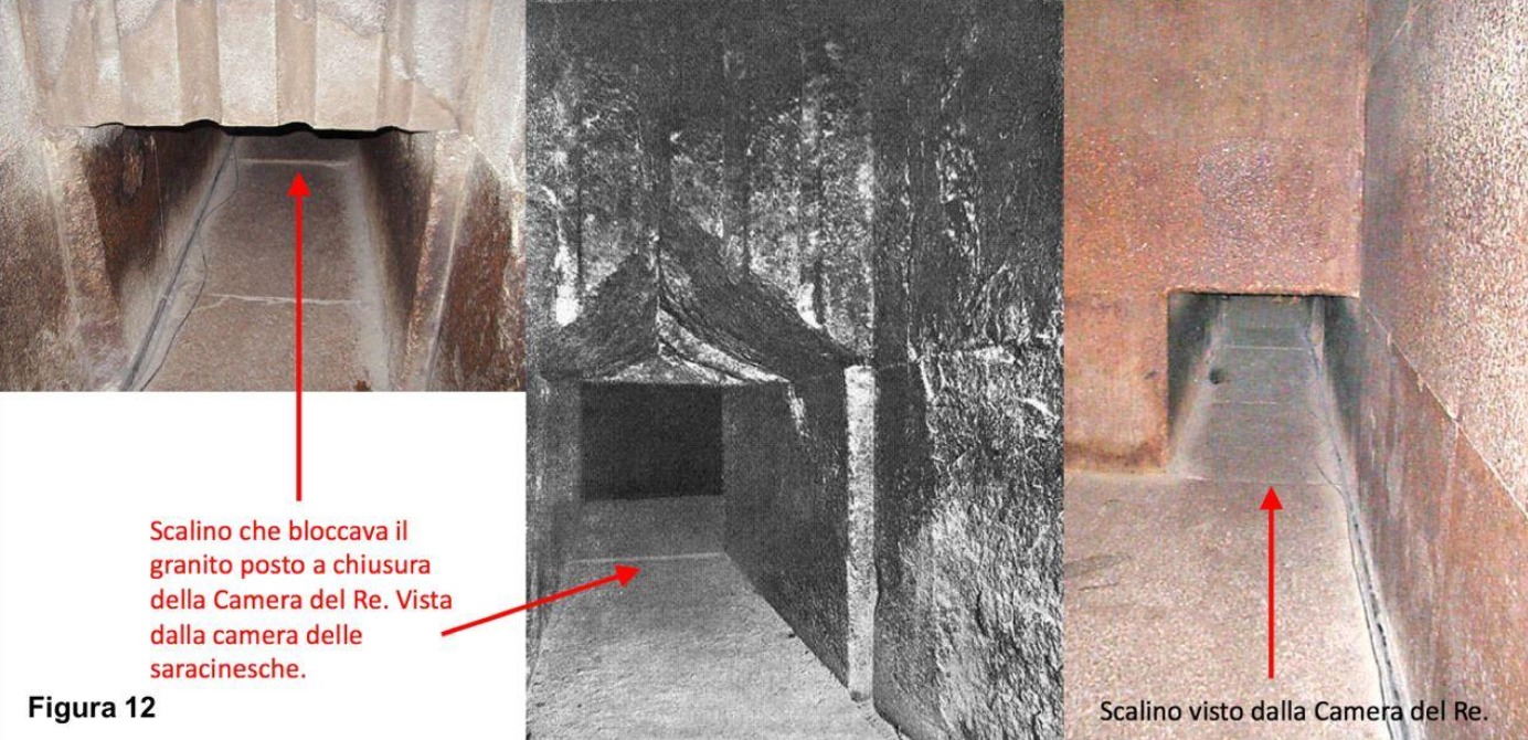 - a filo con la parete nord della Camera del Re è presente un piccolo gradino di qualche centimetro, ovvero il pavimento della camera superiore è più in alto rispetto a quello del corridoio d’ingresso di un paio di centimetri e questo sembrerebbe tanto una sorta di “fermo” per il blocco di granito che chiudeva l’ingresso (Figura 12)